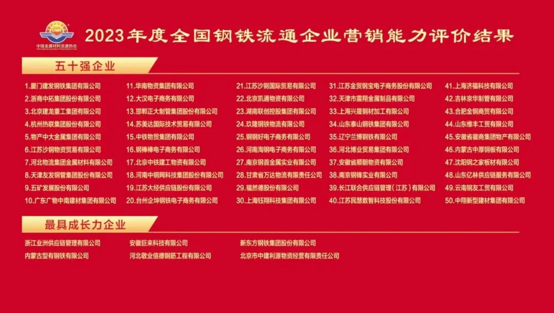 10月30日,第十九屆中國鋼鐵流通促進大會上發(fā)布了2023年度全國鋼鐵流通企業(yè)營銷能力評價結(jié)果(五十強企業(yè)),建發(fā)鋼鐵集團位列年度營銷能力及鋼材銷售業(yè)績行業(yè)第一名。