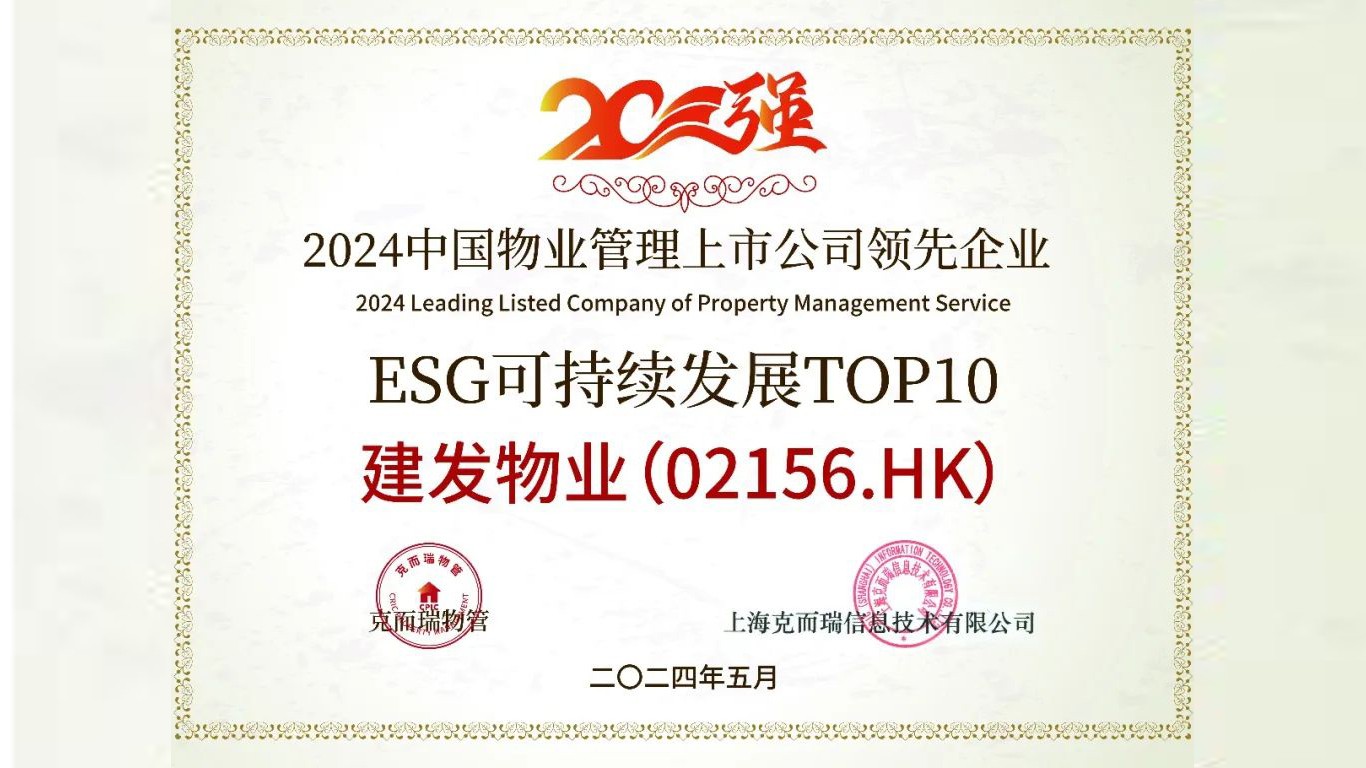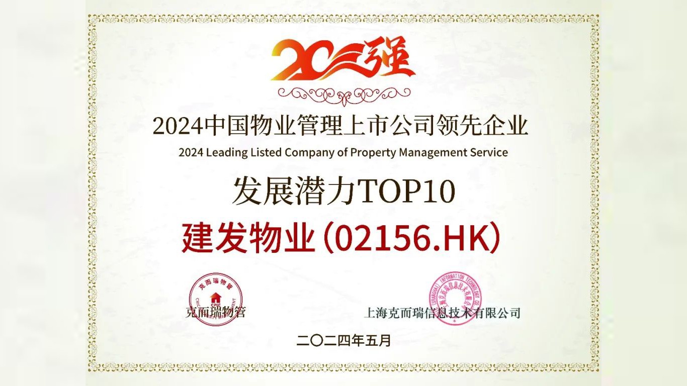 現(xiàn)場,克而瑞發(fā)布了“2024中國物業(yè)管理上市公司系列測評成果”,其中,建發(fā)物業(yè)位列2024中國物業(yè)管理上市公司20強(qiáng)第10位、盈利規(guī)模TOP10第8位、市值認(rèn)可TOP10第9位、發(fā)展?jié)摿OP10第1位,并獲評高質(zhì)量發(fā)展領(lǐng)先企業(yè)、ESG可持續(xù)發(fā)展領(lǐng)先企業(yè)。