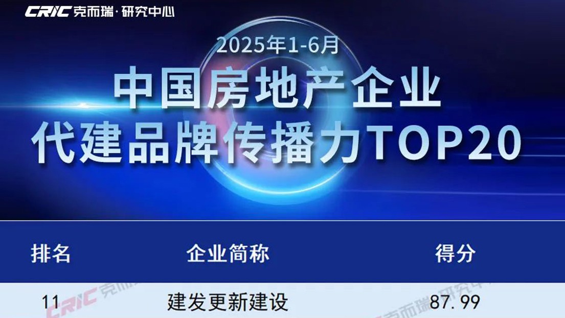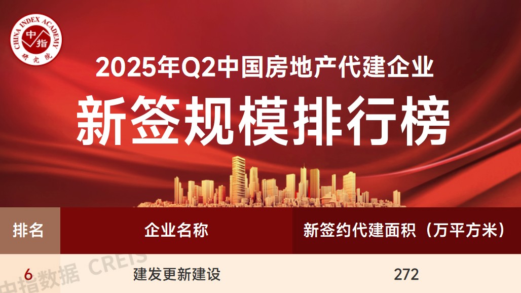 7月8日,中指研究院與克而瑞研究中心分別發(fā)布上半年房地產(chǎn)代建行業(yè)榜單。建發(fā)更新建設(shè)獲評 “2025上半年中國房地產(chǎn)代建企業(yè)新簽規(guī)模TOP12”“Q2新簽規(guī)模 TOP6”“政府代建新簽規(guī)模TOP6” “交付規(guī)模TOP4”;獲評克而瑞“2025年1-6月代建新增規(guī)模TOP11” “品牌傳播力TOP11”。