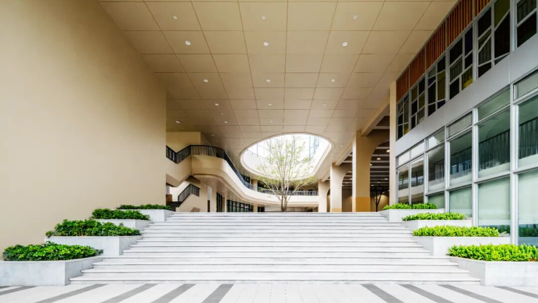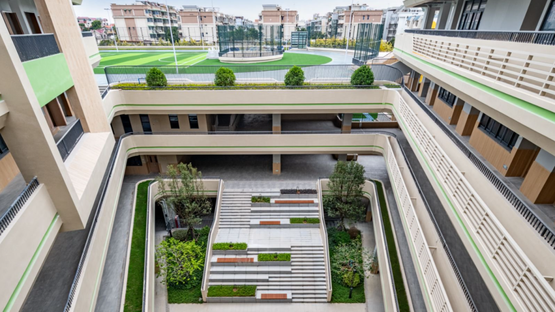 建設過程中,項目團隊創(chuàng)新采用“垂直生長、功能疊加”的“3D校園”模式,實現(xiàn)土地高效利用。校園空間依山就勢,通過建筑扭轉與運動場架空的設計手法,將空中跑道、屋頂花園、觀景平臺串聯(lián),打造與自然融為一體的現(xiàn)代化校園。