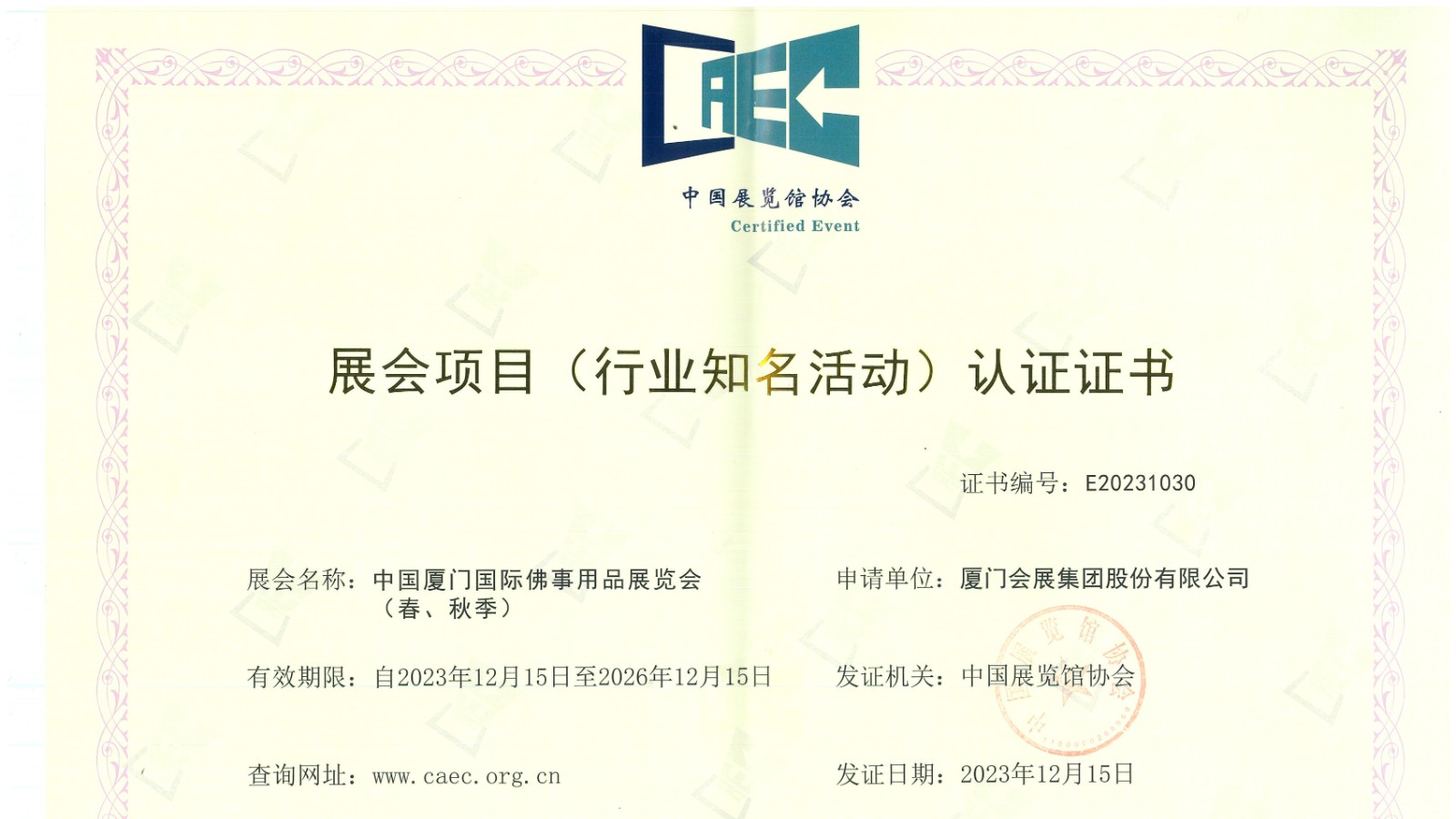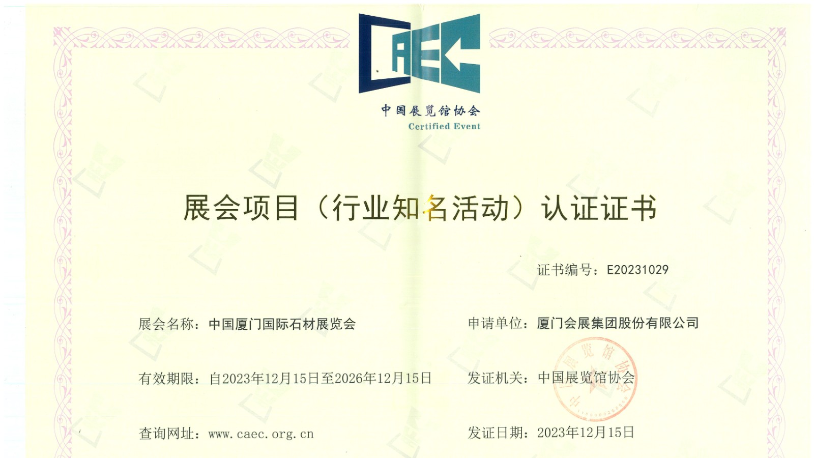 近日,中國展覽館協(xié)會為進(jìn)一步規(guī)范全國展覽會的組織和運(yùn)營,發(fā)起第三批展會項(xiàng)目(行業(yè)知名活動)認(rèn)證工作。建發(fā)會展集團(tuán)三個自辦品牌專業(yè)展“中國廈門國際石材展覽會” “中國廈門國際佛事用品展覽會(春、秋季)” “中國廈門國際茶產(chǎn)業(yè)博覽會(春、秋季)”通過評審并獲認(rèn)證。