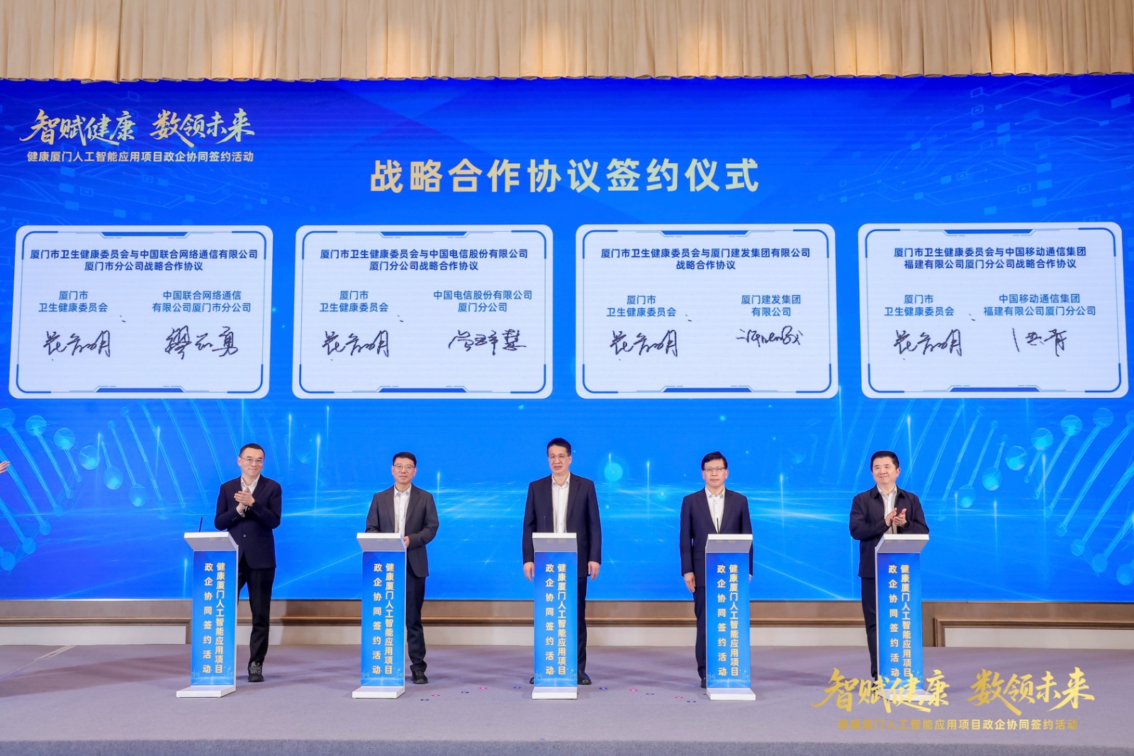 在簽約環(huán)節(jié),市衛(wèi)健委黨組書記、主任花育明,建發(fā)集團黨委書記、董事長許曉曦,中國電信廈門分公司黨委書記、總經(jīng)理曾群慧,中國移動廈門分公司黨委書記、總經(jīng)理洪青,中國聯(lián)通廈門分公司黨委書記、總經(jīng)理繆志勇共同上臺簽署政企協(xié)同戰(zhàn)略合作協(xié)議。“藥耗追溯智慧監(jiān)管(一碼通)平臺”、“區(qū)域影像云一體化服務平臺”、“醫(yī)院智慧后勤一體化服務平臺”三大人工智能應用項目同步上線啟動。